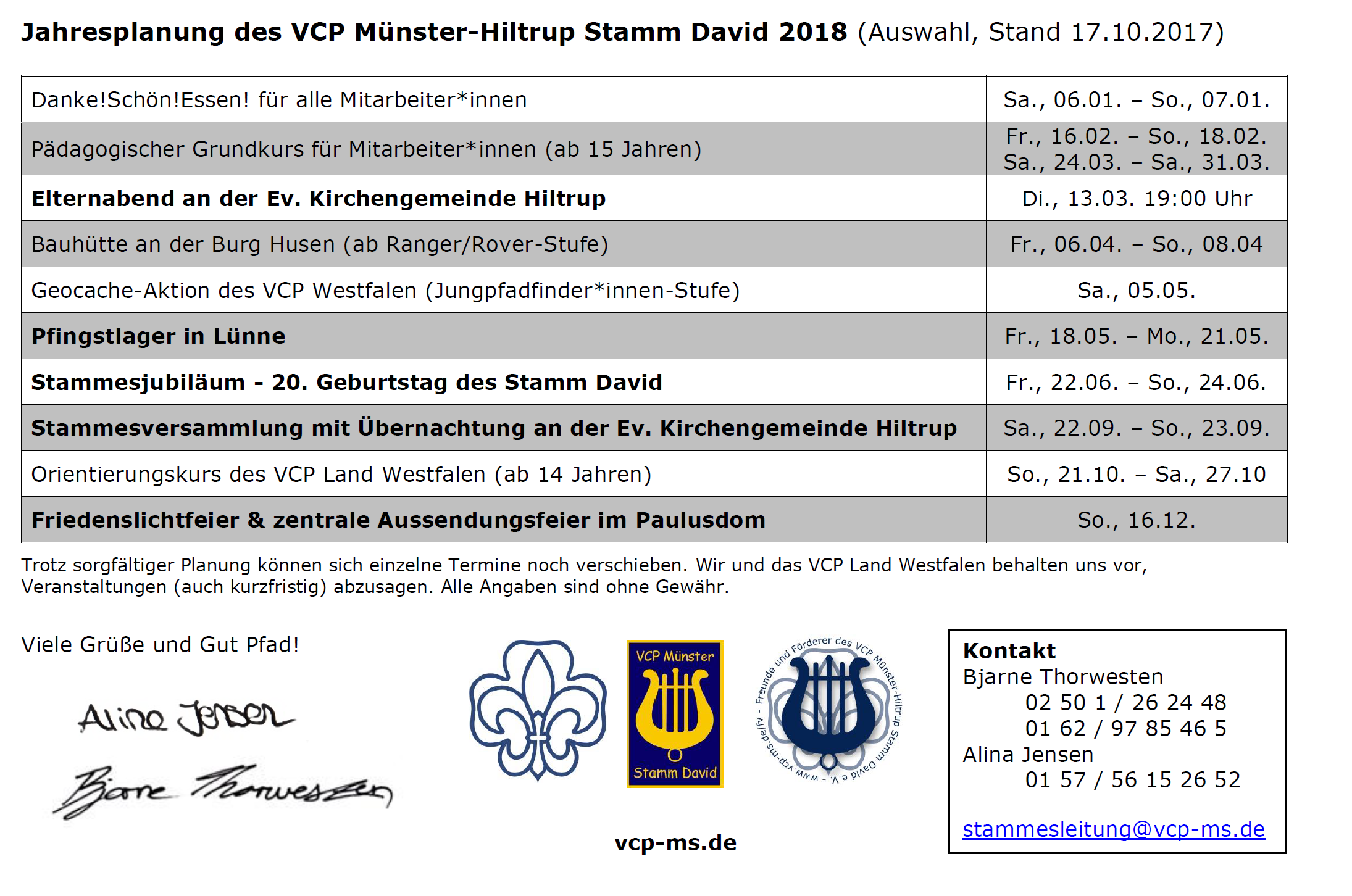 Unsere Jahresplanung für das Jahr 2018 ist fertig! Hier findet ihr alle Termine und Aktionen, Fahrten und Lager der Pfadfinderinnen und Pfadfinder des VCP Münster-Hiltrup in 2018.