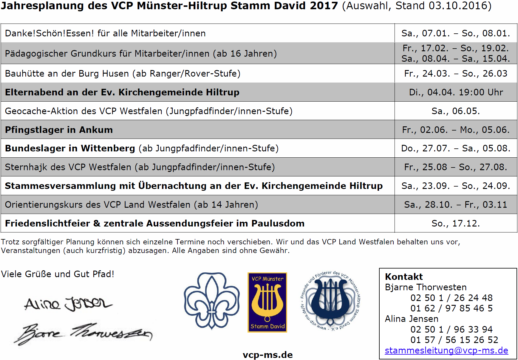 Unsere Jahresplanung für das Reformationsjahr 2017 ist fertig! Hier findet ihr alle Termine und Aktionen, Fahren und Lager der Pfadfinderinnen und Pfadfinder des VCP Münster-Hiltrup in 2017.